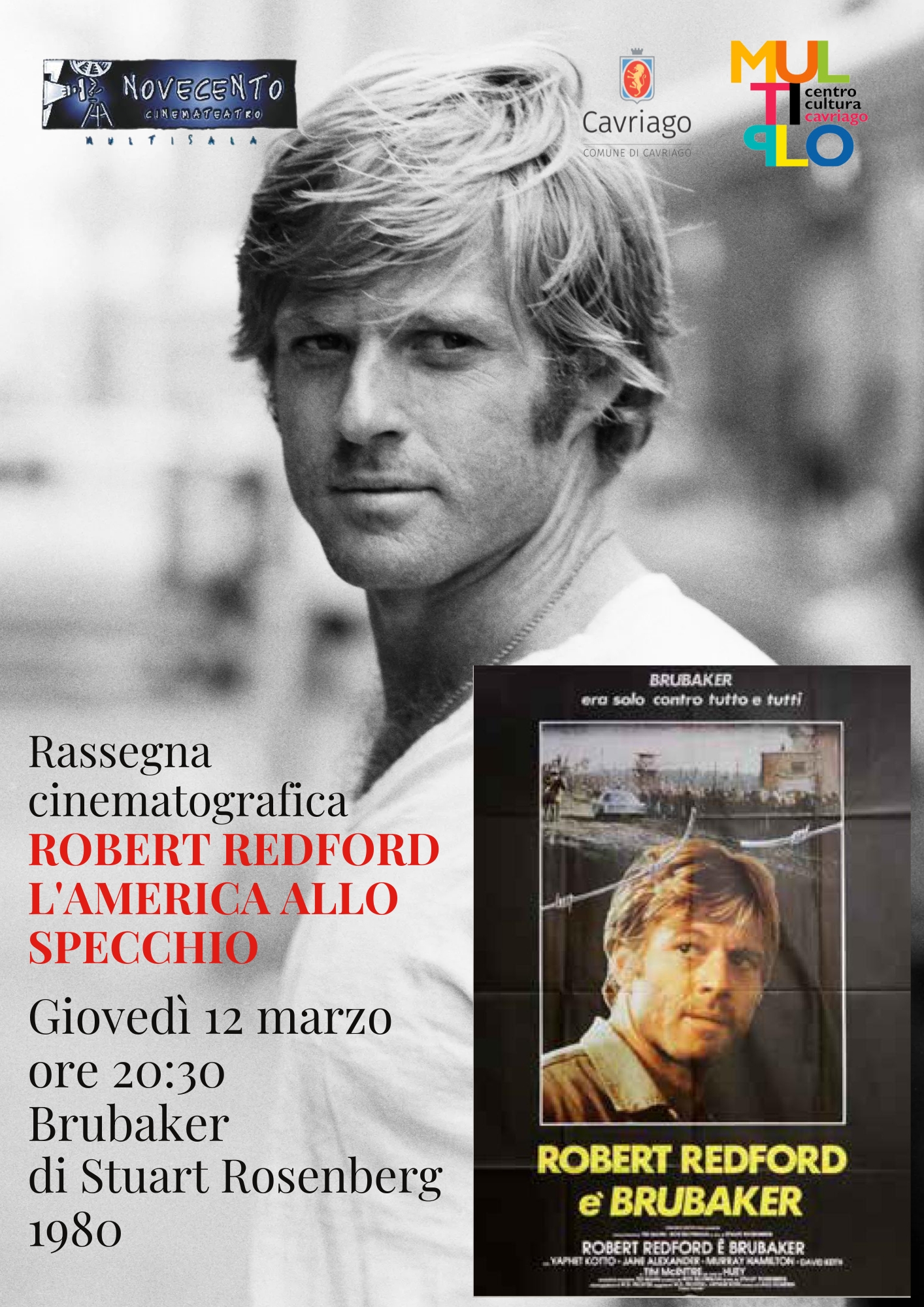 •Giovedì 12 marzo – Ore 20:30 Brubaker (Regia di Stuart Rosenberg, 1980). Una denuncia civile contro gli abusi del sistema carcerario, con una prova intensa di Redford.