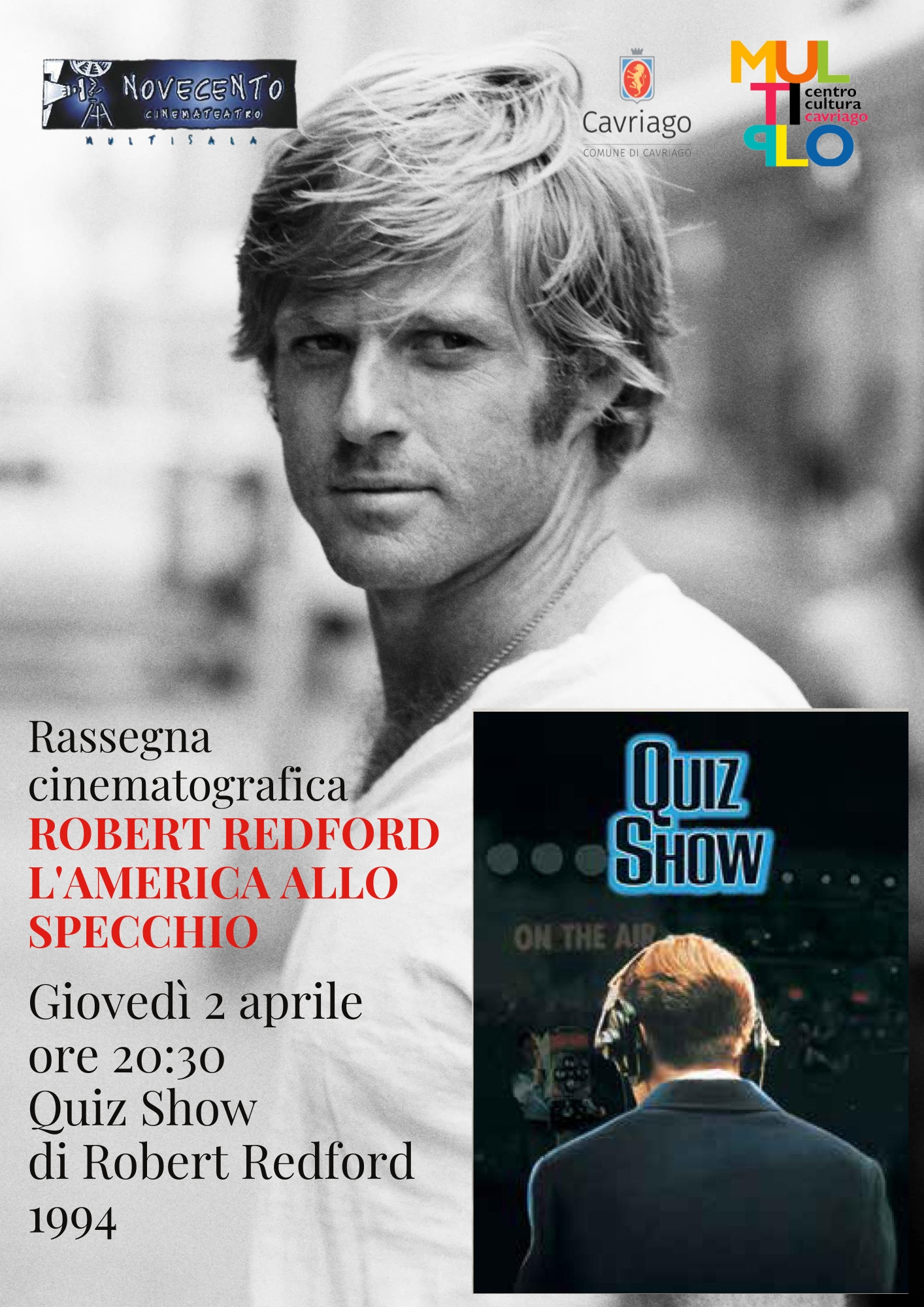 • Giovedì 2 aprile – Ore 20:30 Quiz Show (Regia di Robert Redford, 1994). Redford regista racconta l’America dei quiz truccati e delle verità scomode degli anni ’50.