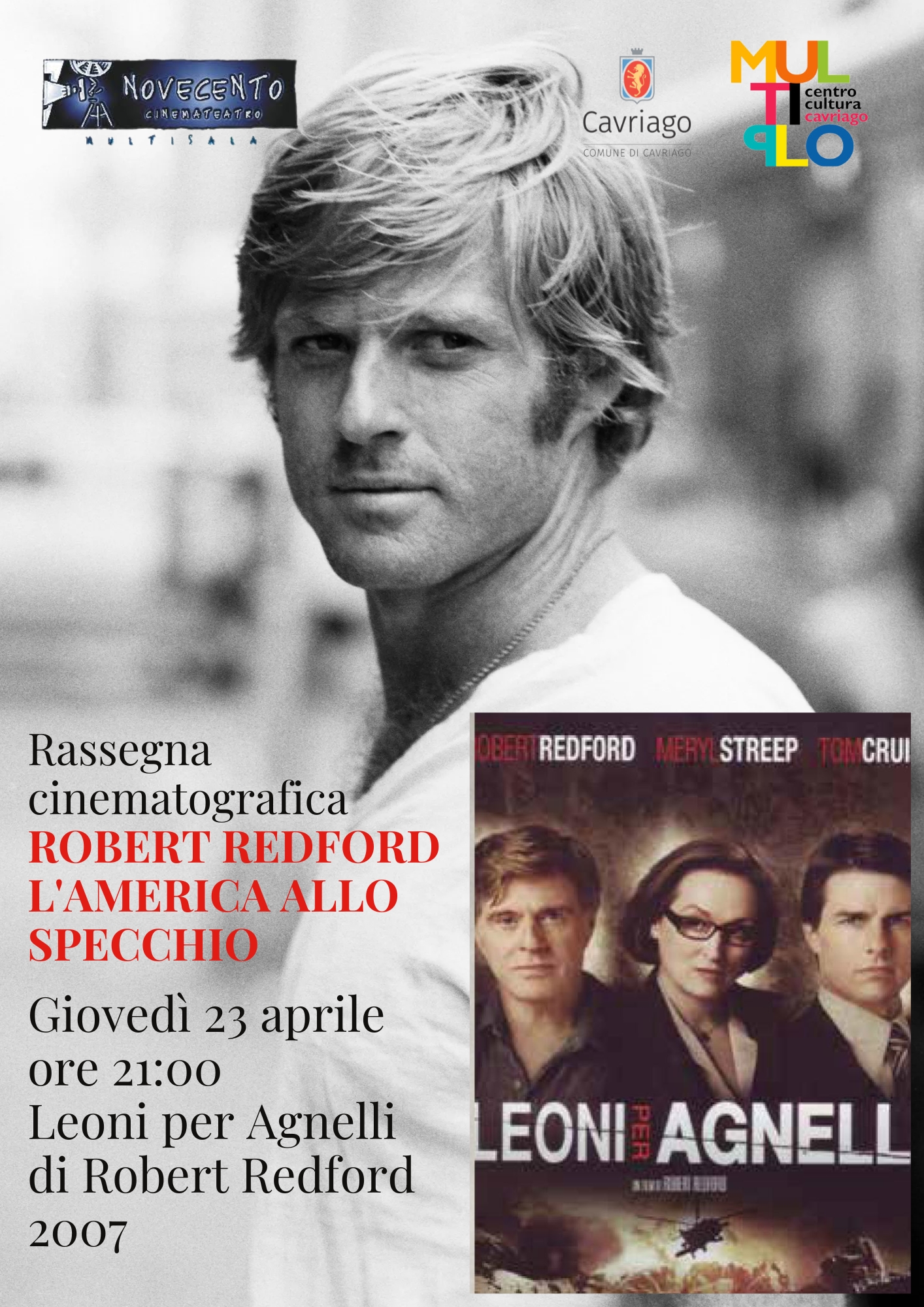 • Giovedì 23 aprile – Ore 21:00 Leoni per Agnelli (Regia di Robert Redford, 2007) Un dialogo sulla guerra, la politica e la responsabilità personale, con Robert Redford accanto a Meryl Streep e Tom Cruise.