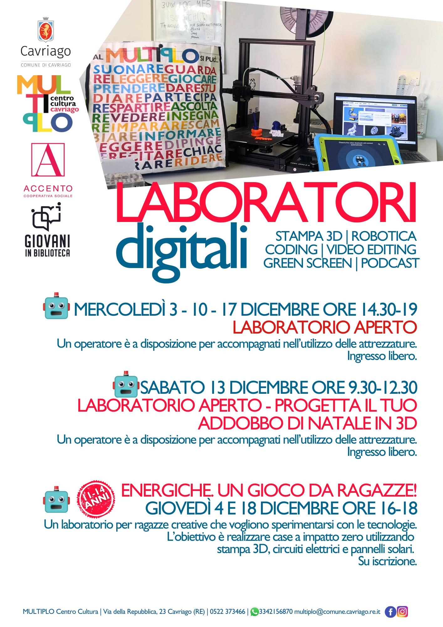 I Laboratori digitali hanno l’obiettivo di facilitare l’accesso alla cultura digitale, all’apprendimento delle nuove alfabetizzazioni a tutte le età e garantire il diritto di accesso a un adeguato livello di competenze digitali. Il Multiplo diventa sempre di più un luogo del ‘fare’ manuale e digitale, accessibile e partecipato. Un luogo di incontro fisico e sociale che favorisce processi di apprendimento, creatività e scoperta.