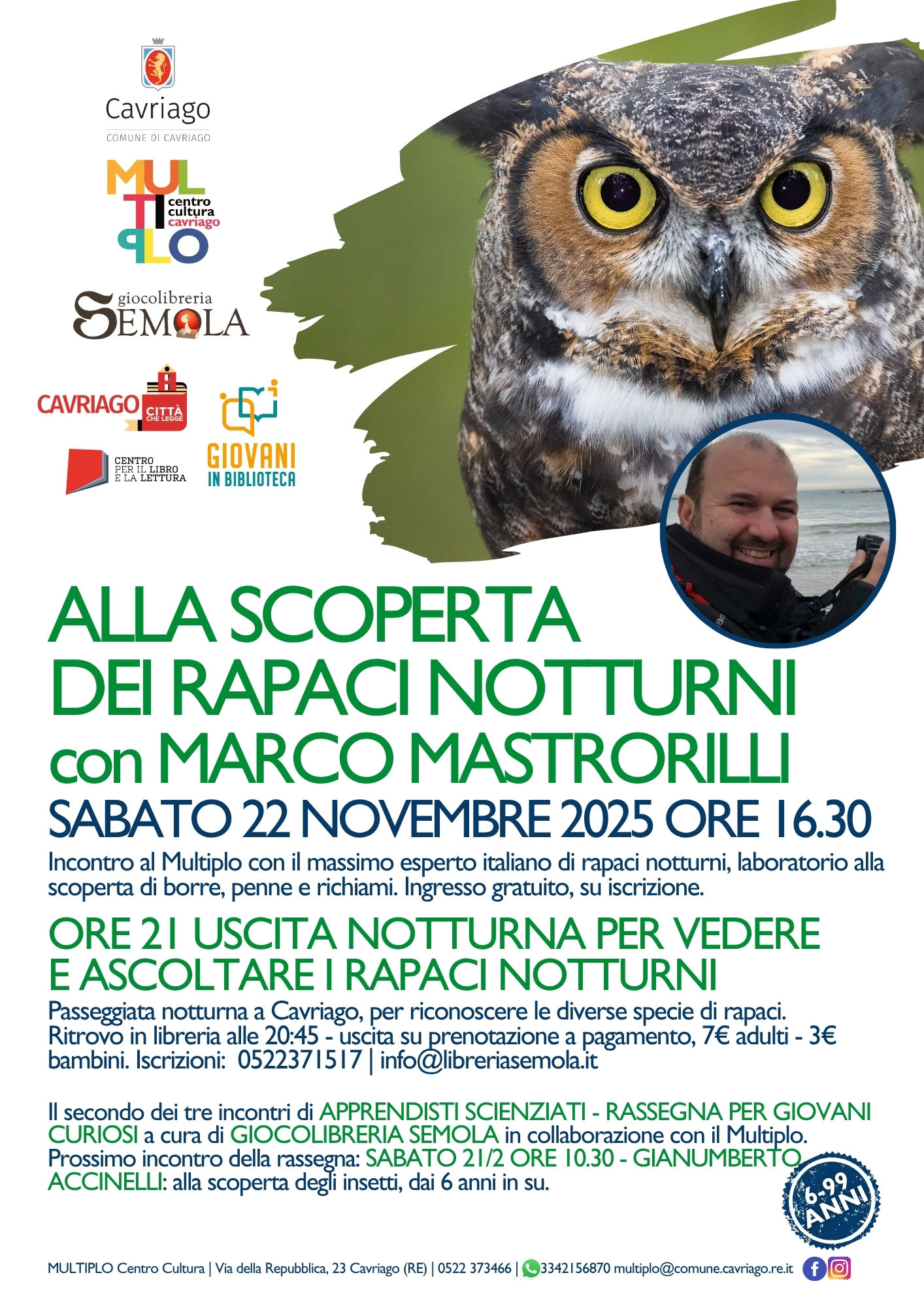 ORE 16.30 Incontro al Multiplo con Marco Mastrorilli, il massimo esperto italiano di rapaci notturni, laboratorio alla scoperta di borre, penne e richiami. Ingresso gratuito, su iscrizione.
