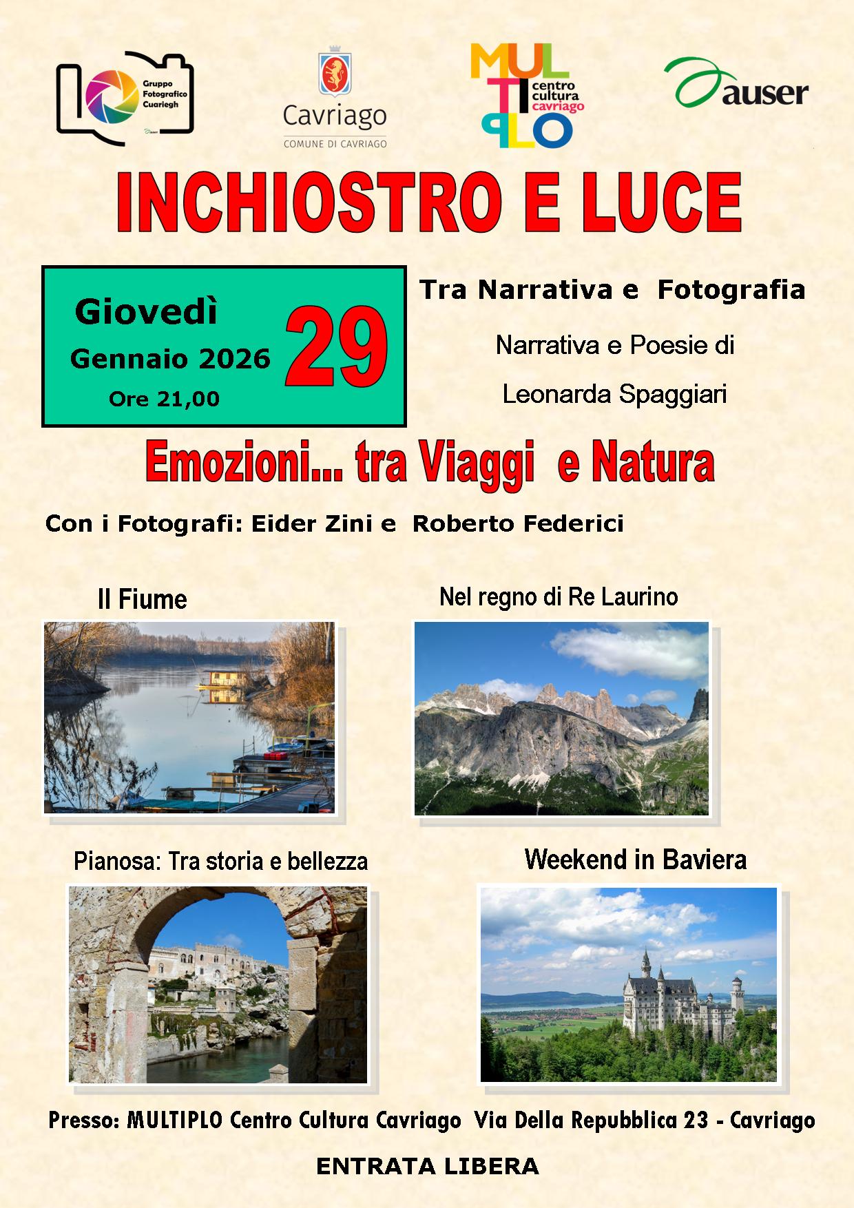 Dopo la pausa Natalizia di Dicembre si Ritorna Giovedì 29 Gennaio 2026 con La programmazione di “INCHIOSTRI E LUCE” serata dedicata al nostro territorio italiano e all’Europa con immagini di Eider Zini e Roberto Federici nella serata ci accompagnerà alcuni brani di musica con il violoncello e poesie di Zini Lina presentate da Leonarda Spaggiari .