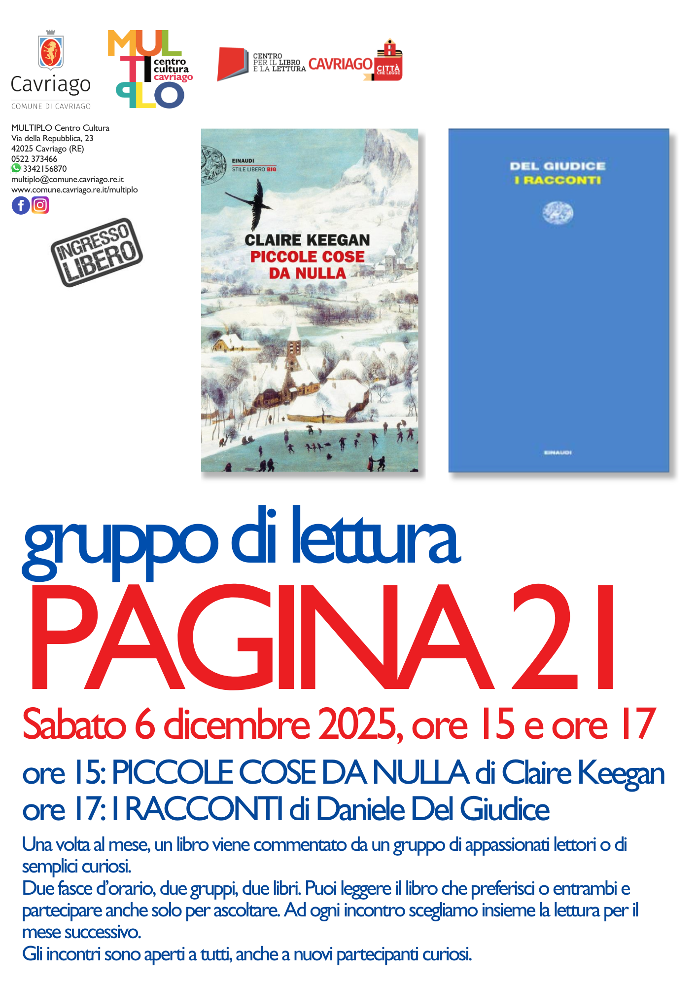Benvenuti nel gruppo di lettura del Multiplo. L'appuntamento mensile per confrontarsi con altri lettori sulla lettura di un libro scelto insieme. Un libro viene commentato da un gruppo di appassionati lettori o di semplici curiosi. È il gruppo di lettura Pagina 21! Questo mese ci confrontiamo sulla lettura di: