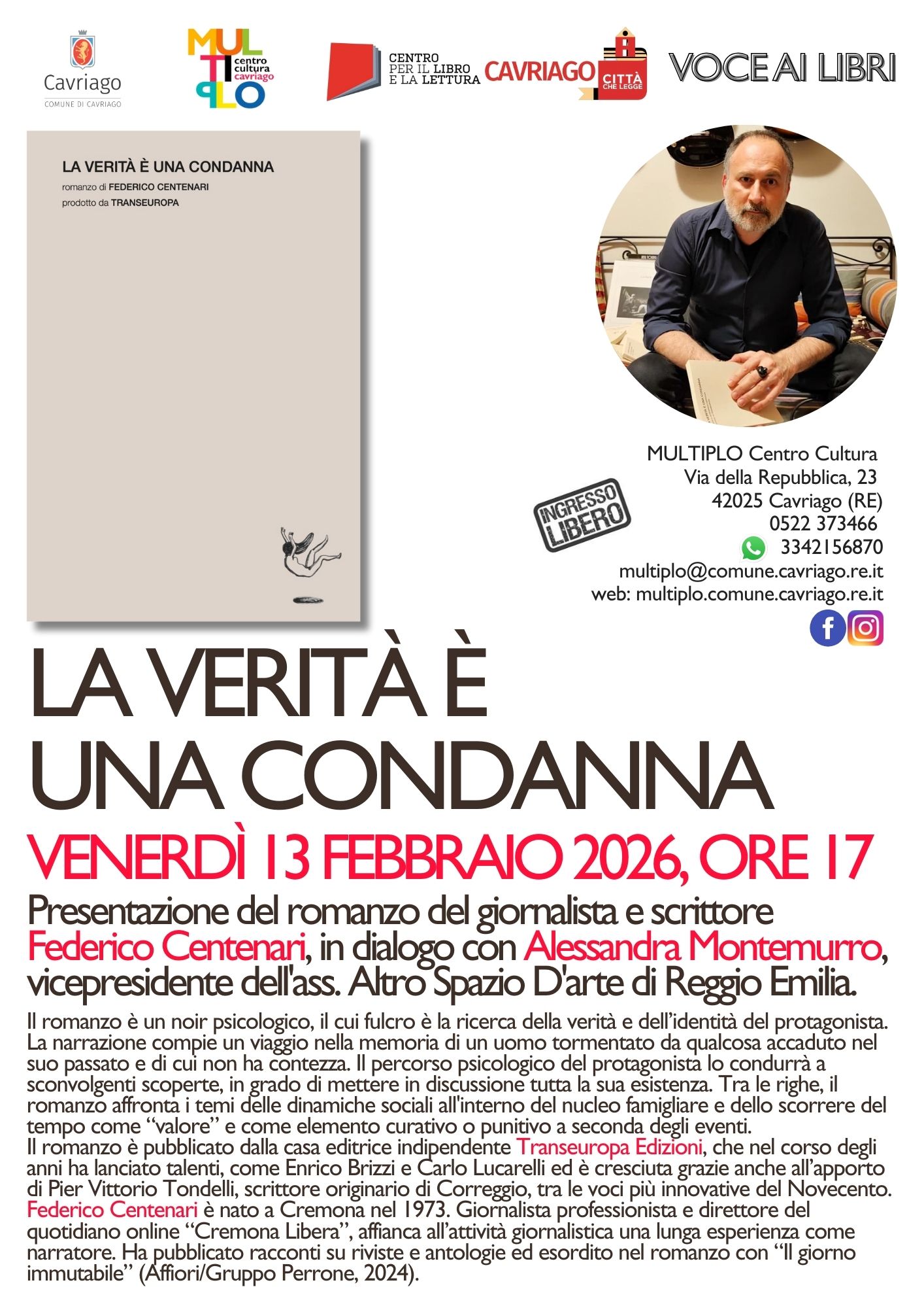 Presentazione del romanzo del giornalista e scrittore Federico Centenari, in dialogo con Alessandra Montemurro, vicepresidente dell'ass. Altro Spazio D'arte di Reggio Emilia.