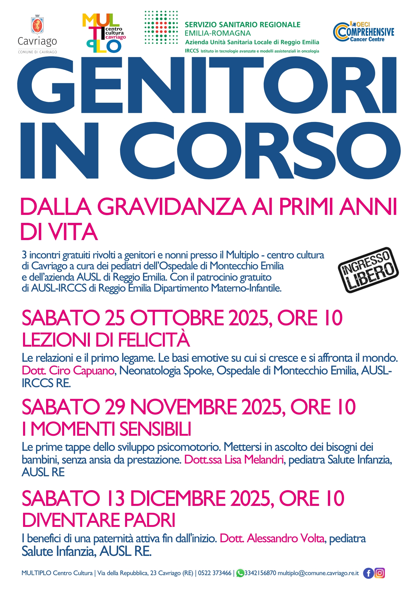 Comincia invece sabato 25 ottobre “Genitori in corso. Dalla gravidanza ai primi anni di vita” il progetto, che fa seguito ad una fortunata serie di incontri tenutisi nel 2017 e poi nel 2019, e che vuole portare le novità scientifiche fuori dagli studi medici e dalle strutture ospedaliere, con incontri tematici aperti e fruibili ad ampie “fasce” di popolazione, con un lessico a portata di tutti. È un progetto ideato e promosso dai Pediatri dell’Ospedale di Montecchio Emilia (che si avvarranno della collaborazione di altri specialisti dell’azienda AUSL di Reggio Emilia) e dal Comune di Cavriago e Multiplo centro cultura. Quest'anno gli incontri saranno tenuti dal dott. Ciro Capuano, pediatra Neonatologia Spoke, ospedale di Montecchio Emilia, dalla dottoressa Lisa Melandri, pediatra Salute Infanzia, AUSL RE e dal dott. Alessandro Volta.