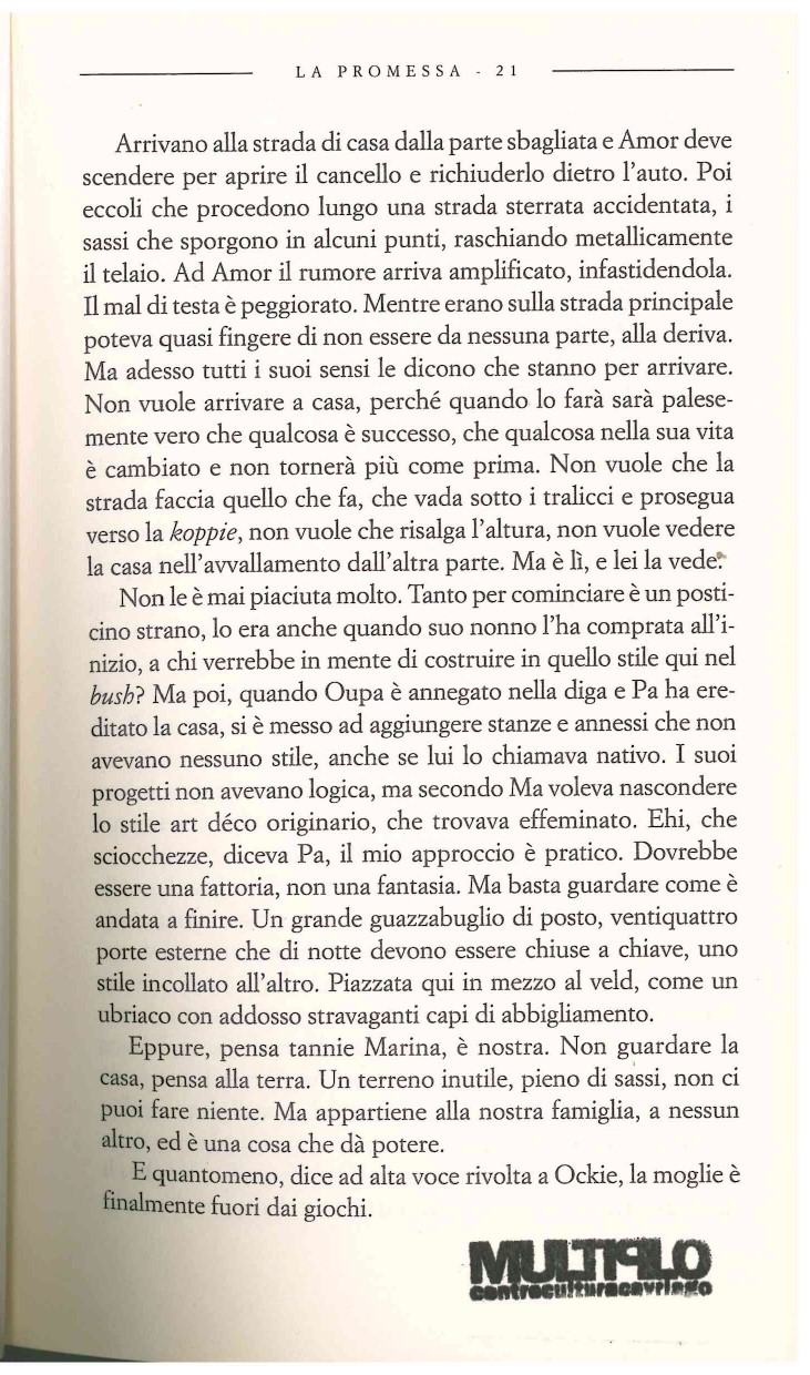 Ultimo libro del sudafricano Daniel Galgut, scritto nel 2021, vincitore del Booker Prize, “La promessa” segue la saga della famiglia bianca degli Swart, vicenda che dura tre decenni, fino all’ epoca attuale, dalla morte della madre di tre figli, che in punto di morte promette alla serva nera, Salome, una casa in eredità. Tale promessa, nel corso degli anni, non viene mai mantenuta, e sembra quasi porre una “maledizione” sugli eredi, colpiti da morti insolite, a volte persino drammaticamente ironiche, fino ad una risoluzione finale che si lascia al lettore.